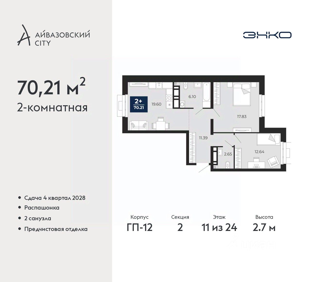 2-комн. квартира от застройщика с предчистовой отделкой в ЖК "Айвазовский City" на 11 этаже. Общая площадь: 70.21 кв.м., жилая: 30.47 кв.м., площадь просторной кухни-столовой: 19.6 кв.м. Квартира - распашонка, без проходных комнат, окна выходят на paзные стороны дома. В квартире один совмещенный и один раздельный санузел. Высота потолков 2.7 м.