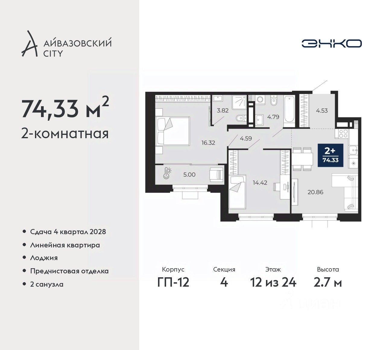 2-комн. квартира с предчистовой отделкой в ЖК "Айвазовский City" на 12 этаже. Общая площадь: 74.33 кв.м., жилая: 30.74 кв.м., площадь просторной кухни-столовой: 20.86 кв.м. Комнаты изолированные, все окна выходят на одну сторону. В квартире одна лоджия, два совмещенных санузла. Высота потолков 2.7 м.