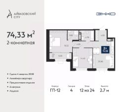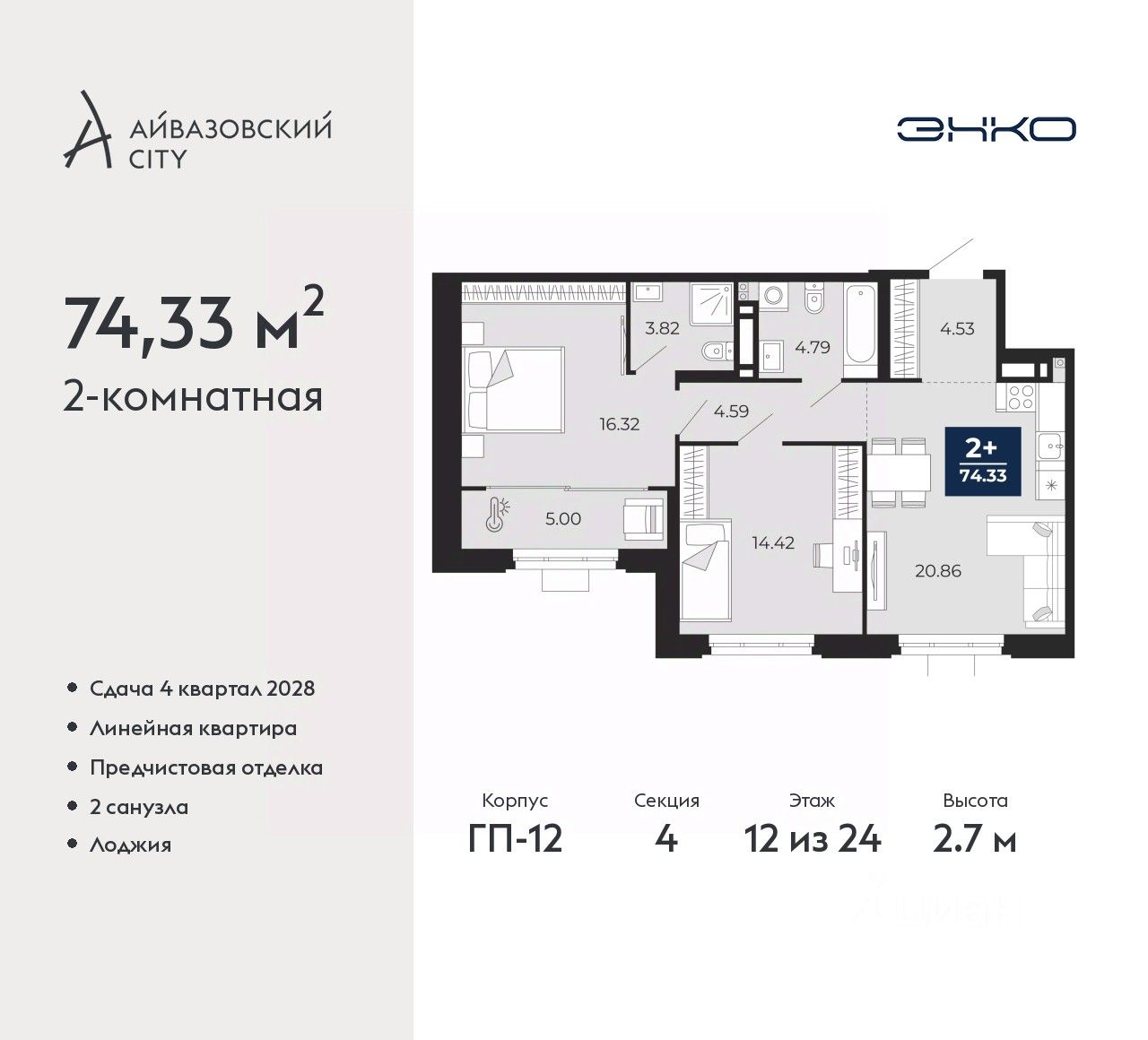 Двухкомнатная квартира с предчистовой отделкой в ЖК "Айвазовский City" на 12 этаже. Общая площадь: 74.33 кв.м., жилая: 30.74 кв.м., площадь просторной кухни-столовой: 20.86 кв.м. Комнаты изолированные, все окна выходят на одну сторону. В квартире одна лоджия, два совмещенных санузла. Высота потолков 2.7 м.