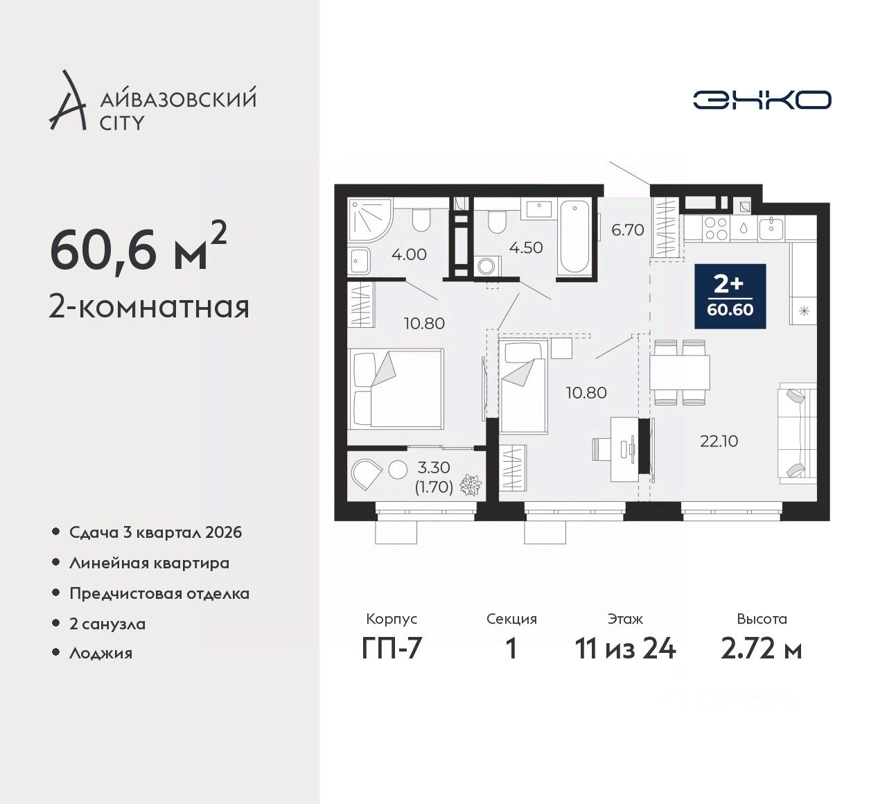 Продается 2-комн. квартира с предчистовой отделкой в ЖК "Айвазовский City" на 11 этаже. Общая площадь: 60.6 кв.м., жилая: 21.6 кв.м., площадь просторной кухни-столовой: 22.1 кв.м. Комнаты изолированные, все окна выходят на одну сторону. В квартире одна лоджия, два совмещенных санузла. Высота потолков 2.72 м.