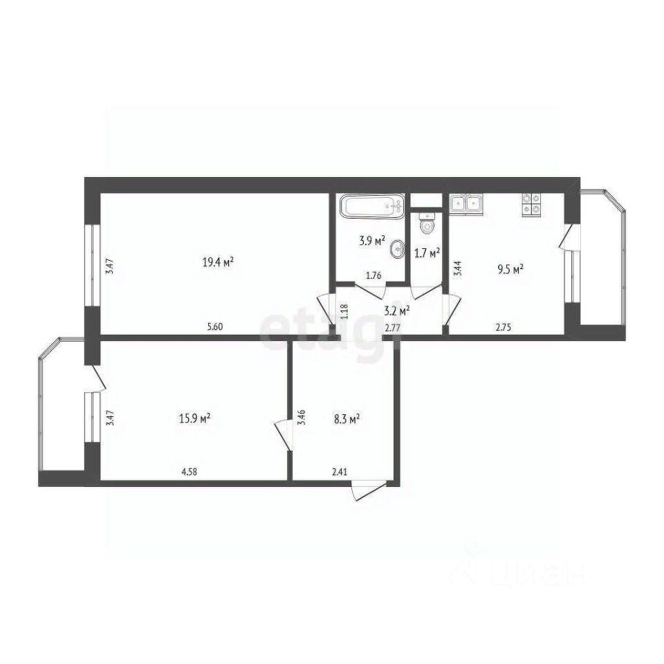 - гостиная (19 кв. м),