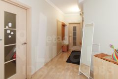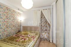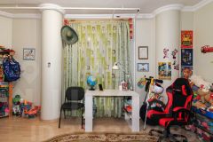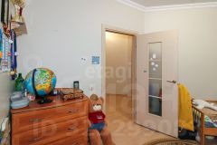 В квартире остаются все необходимые для комфортной жизни вещи: кухонный гарнитур с посудомоечной машиной, барная стойка со стульями, диван, встроенный шкаф, детская кровать, стеллаж и комод.