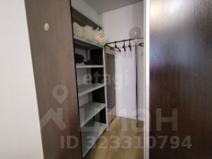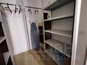 В комнате на полу ламинат. Ниша огорожена дверью - купе. Установлены стеллажи для хранения вещей.