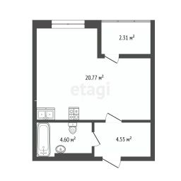 В квартире очень удобная и многофункциональная планировка, сделано грамотное зонирование: просторная кухня-гостиная (20.77 м²), где достаточно места для организации как зоны отдыха, так и рабочего пространства, совмещенный санузел (4.6 м²) и утепленная лоджия (2.31 м²), которая станет отличным местом для отдыха!