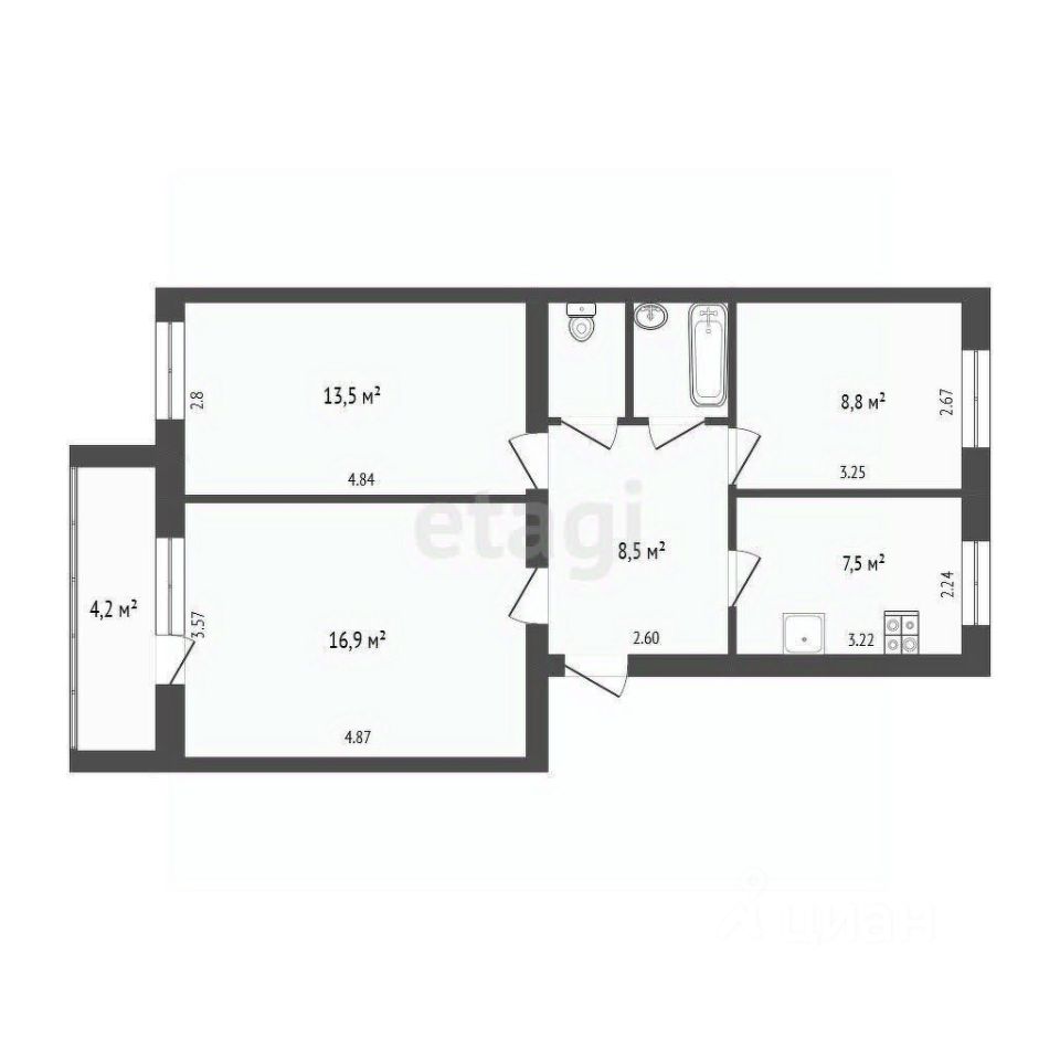 Общая площадь 59 кв.м + застеклённая лоджия 4,2 кв.м для отдыха и хранения.