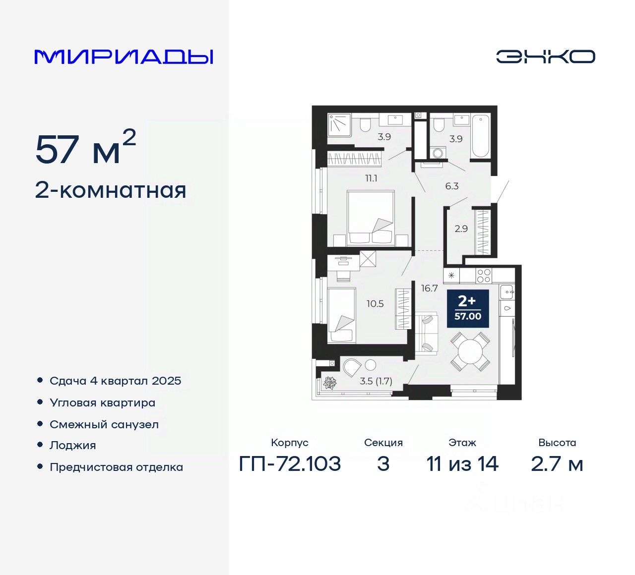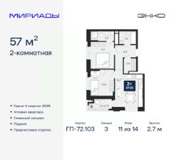 2-комн. квартира от застройщика с предчистовой отделкой в ЖК "Мириады" на 11 этаже. Общая площадь: 57 кв.м., жилая: 21.6 кв.м., площадь просторной кухни-столовой: 16.7 кв.м. Угловая квартира, очень светлая, естественная вентиляция при открытии окон. В квартире одна лоджия, один совмещенный санузел. Высота потолков 2.7 м.