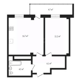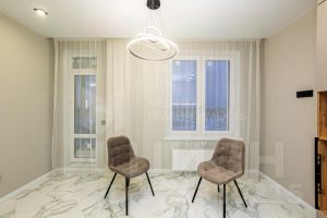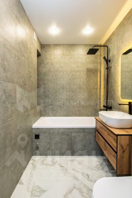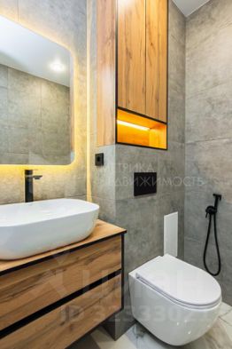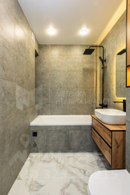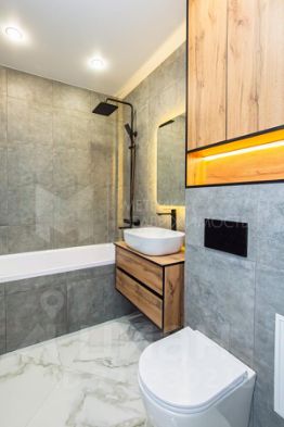 Современная ванная комната оборудована качественной сантехникой, стильными подсветками и встроенным шкафчиком. Полы — керамогранит и ламинат 33 класса, что обеспечивает долговечность и комфорт.