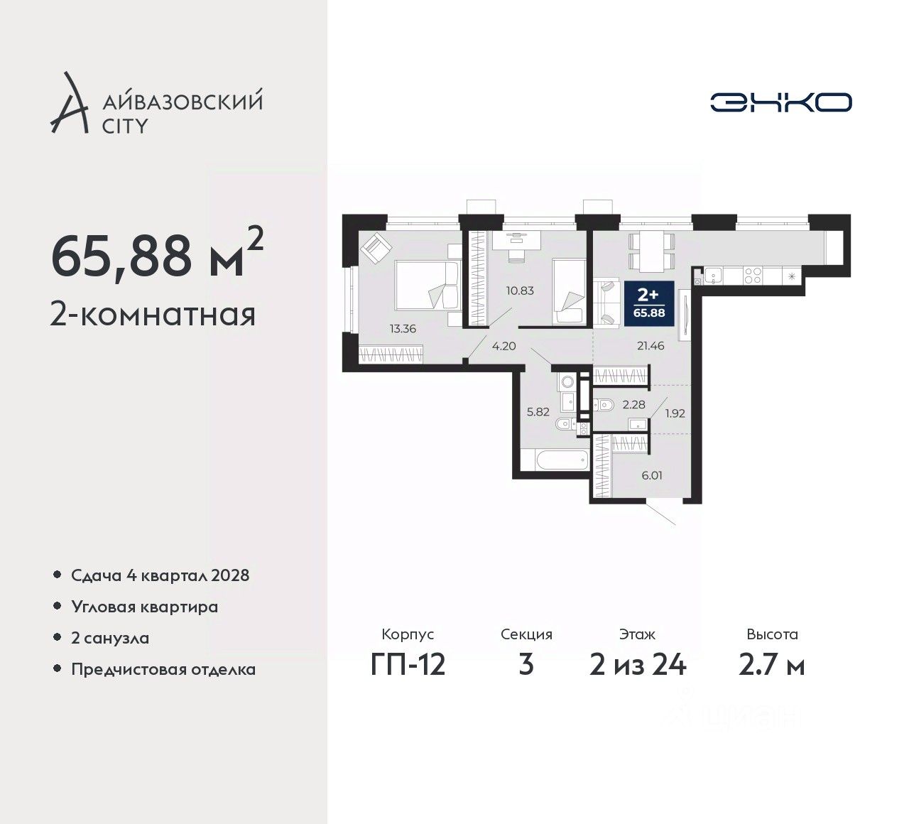Продается 2-комн. квартира с предчистовой отделкой в ЖК "Айвазовский City" на 2 этаже. Общая площадь: 65.88 кв.м., жилая: 24.19 кв.м., площадь просторной кухни-столовой: 21.46 кв.м. Квартира угловая, окна oбecпeчивaют paвнoмepнoe ocвeщeниe в тeчeниe дня. В квартире один совмещенный и один раздельный санузел. Высота потолков 2.7 м.