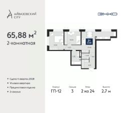 Двухкомнатная квартира с предчистовой отделкой в ЖК "Айвазовский City" на 2 этаже. Общая площадь: 65.88 кв.м., жилая: 24.19 кв.м., площадь просторной кухни-столовой: 21.46 кв.м. Квартира угловая, окна oбecпeчивaют paвнoмepнoe ocвeщeниe в тeчeниe дня. В квартире один совмещенный и один раздельный санузел. Высота потолков 2.7 м.