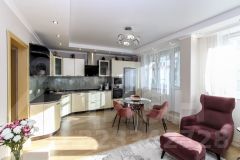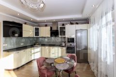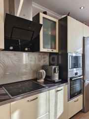Кухонный гарнитур выполнен на заказ, остаётся новым владельцам вместе со встроенной техникой — всё готово для комфортной жизни.