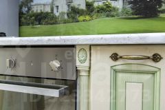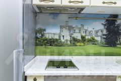 Просторная кухня - гостиная с гарнитуром, обеденная зона и зона отдыха. В зоне кухни на полу кафель.
