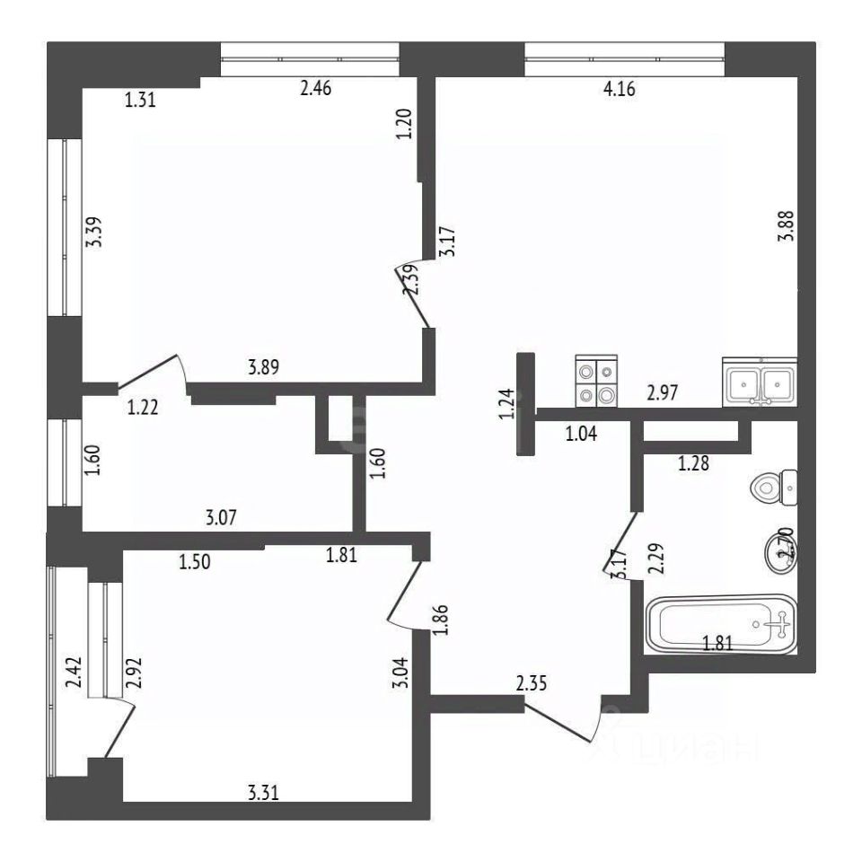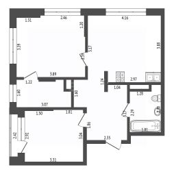 Формат: 3+ (кухня-гостиная + две изолированные комнаты)