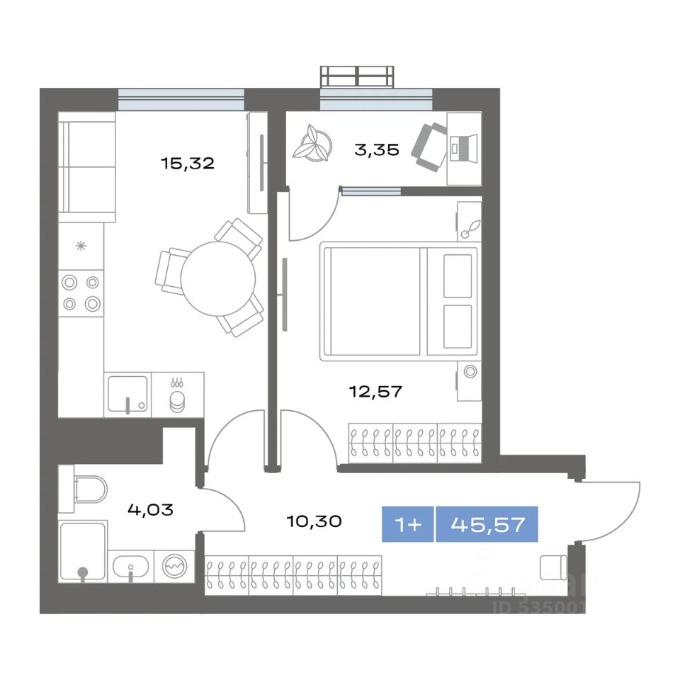 1-комн. квартира, 45,57 м²