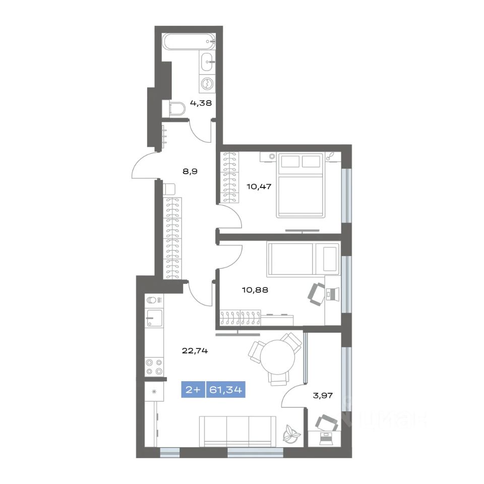 2-комн. квартира, 61,34 м²