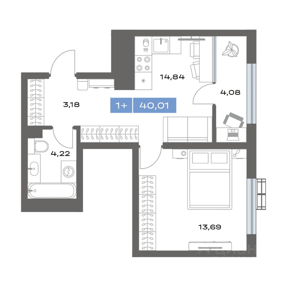 1-комн. квартира, 40,01 м²