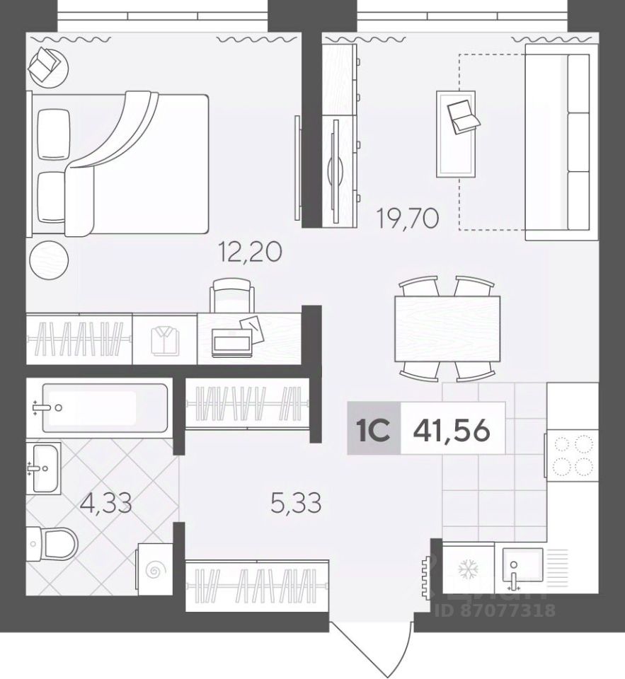 Продаётся 1-комнатная квартира в строящемся доме (ГП 2 (Сергея Корепанова, 34)), срок сдачи: IV-кв. 2027, общей площадью 41.56 кв.м., на 7 этаже. Новый жилой комплекс "Скандиа. Квартал у Леса" от Специализированного застройщика "СКАНДИА У ЛЕСА" расположен в г. Тюмень на ул. Бориса Прудаева.