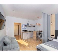 Площадь квартиры составляет 27.70 кв.м., из которых зона кухни отделена на нее приходится 8 кв.м.