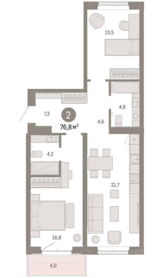 Квартира с кухней-гостиной и двумя спальнями в кварталах "На Минской". Особенности планировки: окна на две стороны, вид во двор, разнесённые спальни, предчистовая отделка, мастер-спальня, балкон.
