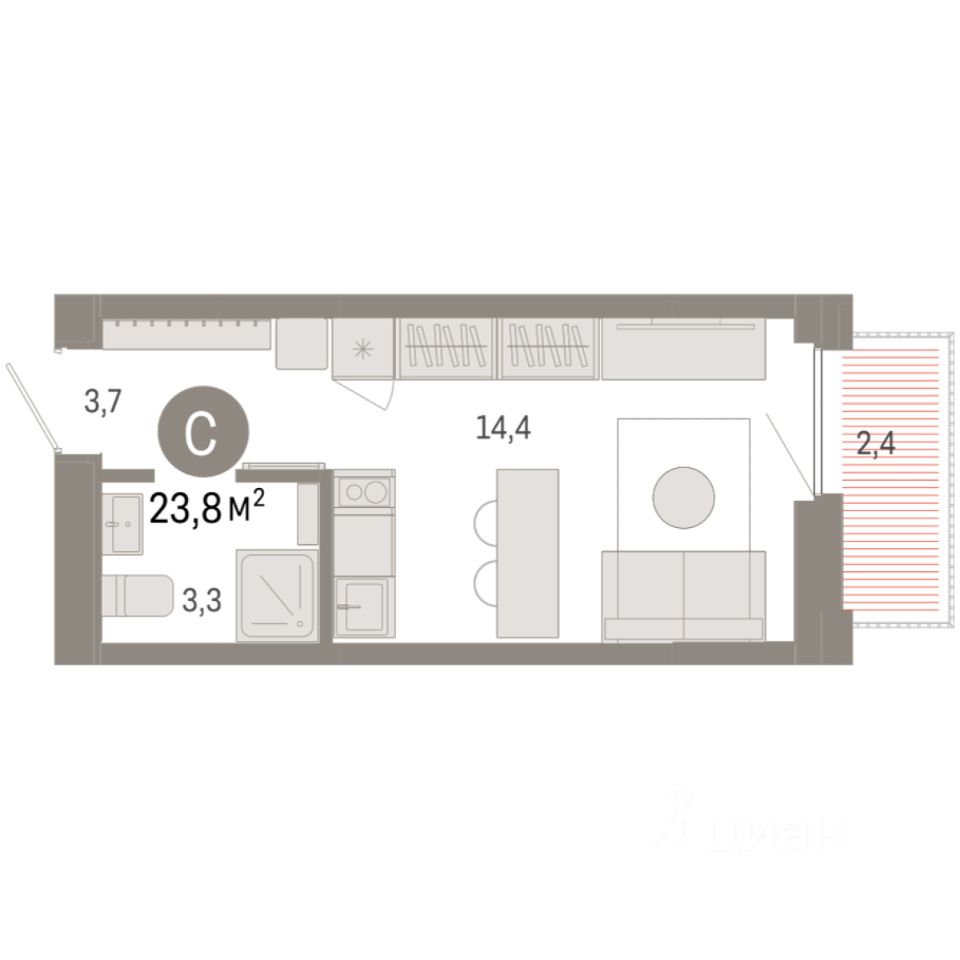 Продается 1-комн. студия с предчистовой отделкой в ЖК "Зарека" на 3 этаже. Общая площадь: 23.83 кв.м., площадь гостиной 14.4 кв.м., из которых 5 кв.м. выделено под кухонную зону. Все окна выходят на одну сторону. В квартире один балкон, один совмещенный санузел. Высота потолков 2.7 м.