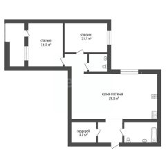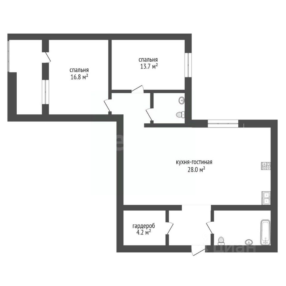 В продаже просторная квартира в современном ЖК, квартира формата 2+, с большой кухней-гостиной площадью 28 м2 и двумя большими спальнями 13,7 и 16,8 м2,  функциональная планировка, есть просторная гардеробная и балкон с окнами в пол, два санузла.
