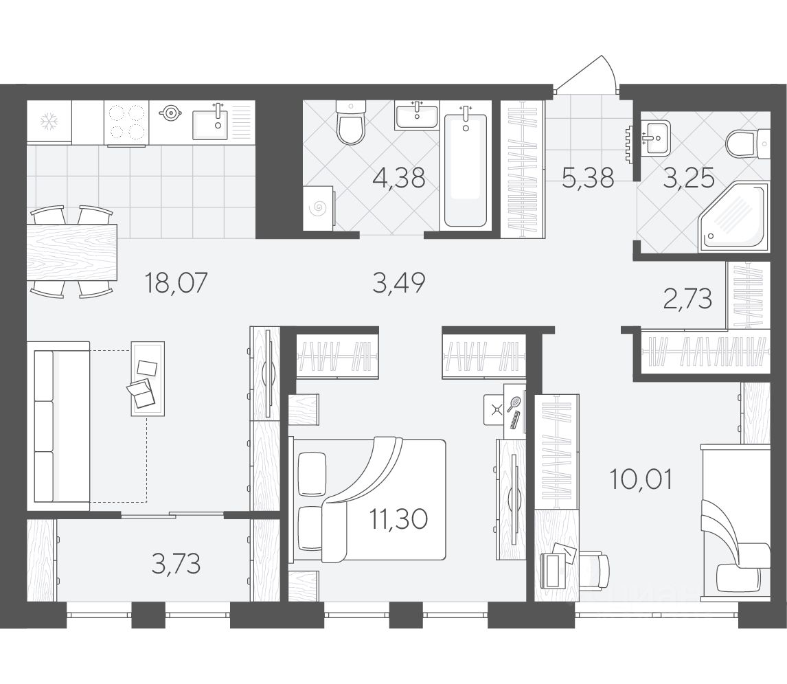 Продаётся 2-комнатная квартира в строящемся доме (ГП-1), срок сдачи: IV-кв. 2025, общей площадью 62.34 кв.м., на 7 этаже. Новый жилой комплекс "Скандиа. Квартал в Комарово Парк" от застройщика "Скандиа" расположен в Калининском округе Тюмени в районе ул. Николая Глебова.