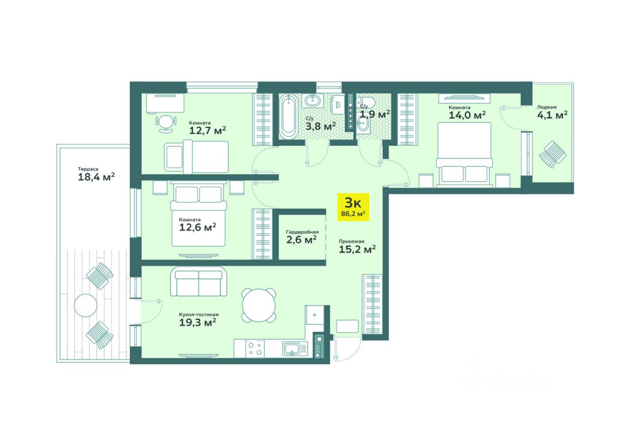 Общая площадь86,19 м²