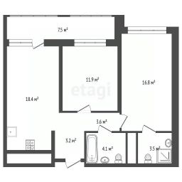 Квартира 69 кв с кухней гостиной 18,4 кв.м., двумя просторными спальнями 11,9 кв.м и 16,4 кв.м со своим сан.узлом или гардеробной (мастер-спальня), при входе в квартиру большой сан.узел и ниша под вместительный шкаф. Огромная лоджия 7,5 кв.м!