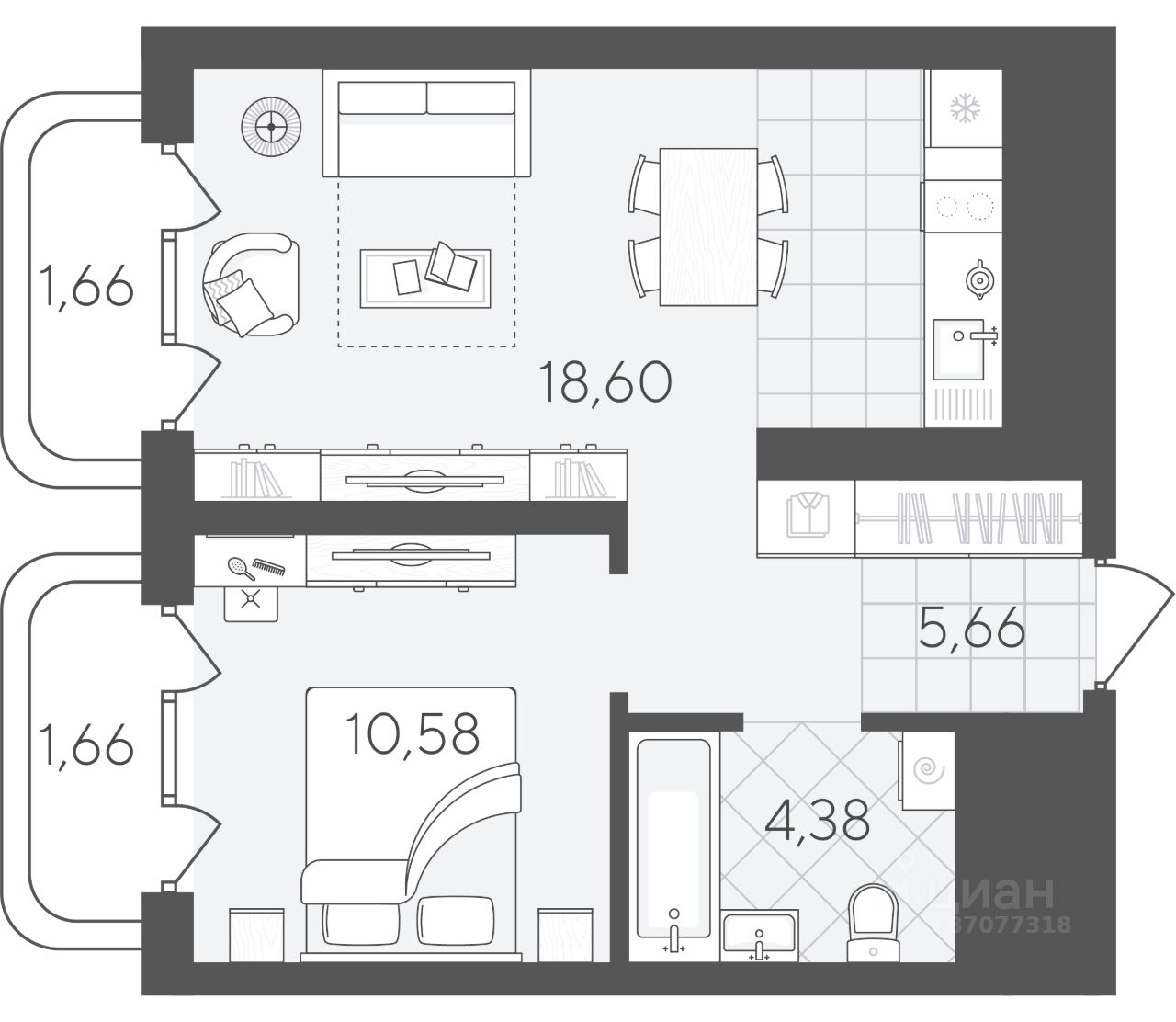 В квартире есть кухня-гостиная и отдельная спальня, предусмотрены ниши под шкафы-купе. Это позволяет оставить больше пространства для жизни.