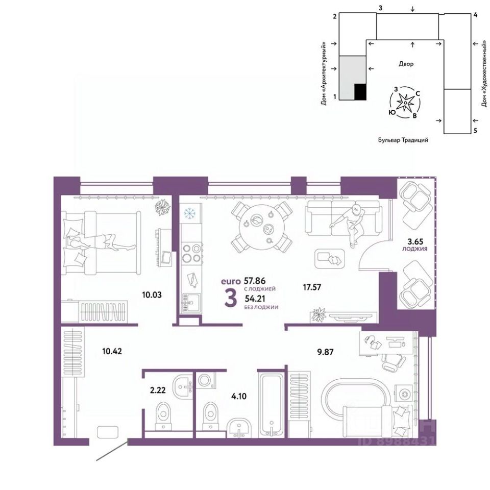 Продается 3комнатная квартира на 15 этаже от застройщика Страна Девелопмент. Площадь квартиры 57,86 кв. м.