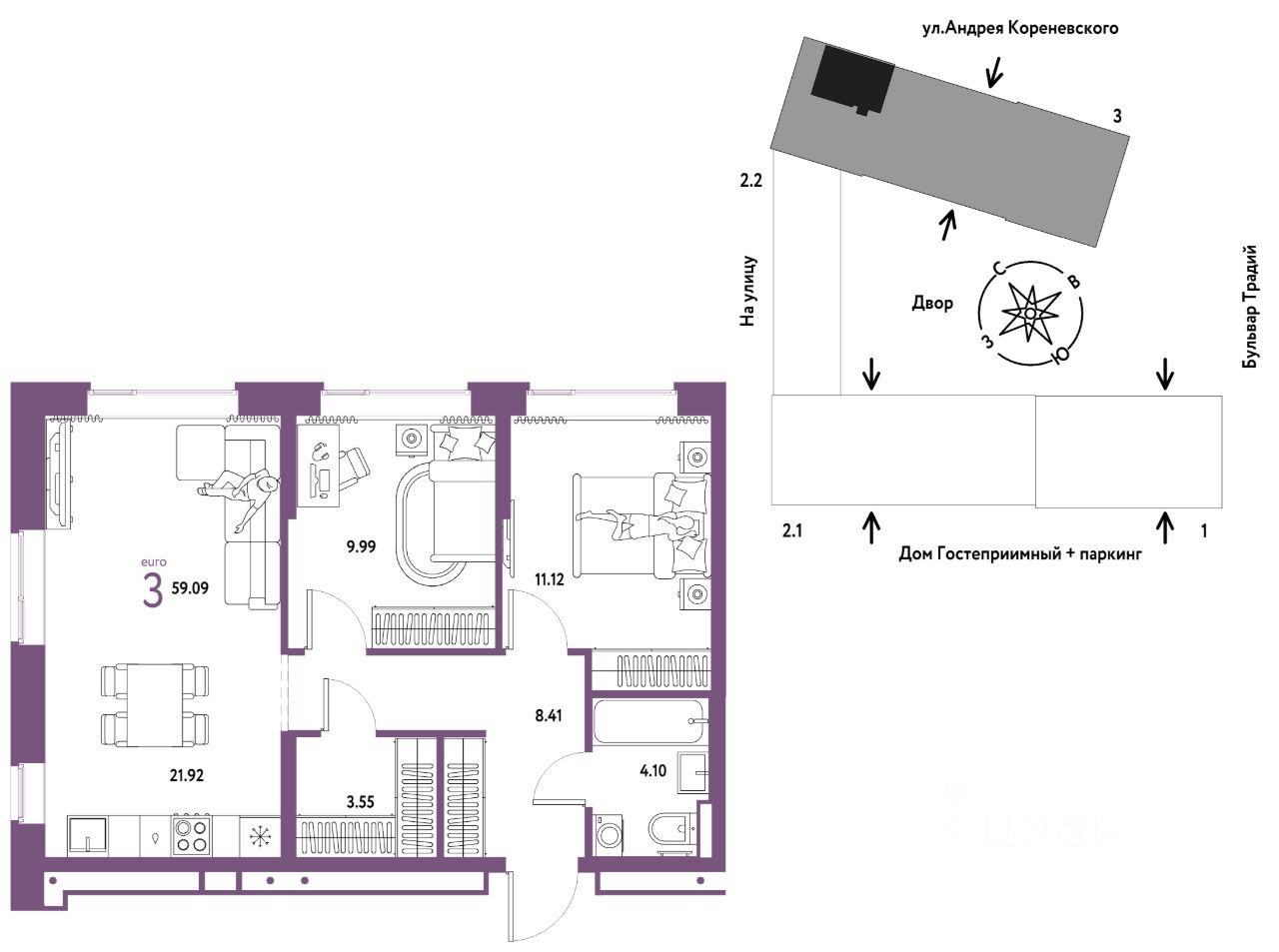 Продается 3комнатная квартира на 13 этаже от застройщика Страна Девелопмент. Площадь квартиры 59,09 кв. м.