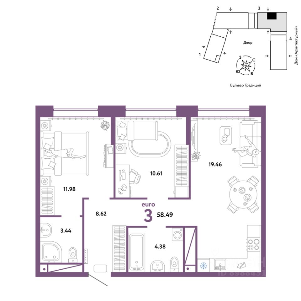 Продается 3комнатная квартира на 14 этаже от застройщика Страна Девелопмент. Площадь квартиры 58,49 кв. м.