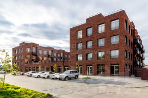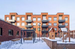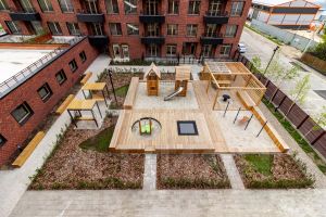 Во дворе расположены детская игровая площадка и лаунж-зона с патио из натуральных материалов. 4-этажный дом с двумя секциями рассчитан всего на 56 квартир.