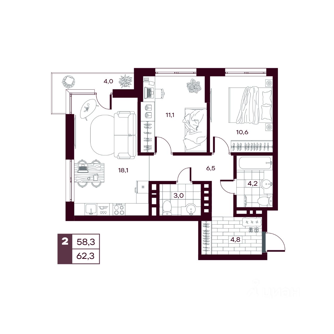 Общая площадь62,28 м²