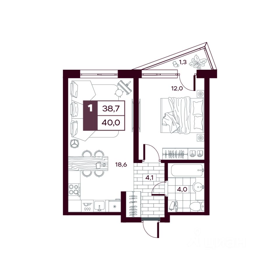 Общая площадь40,61 м²