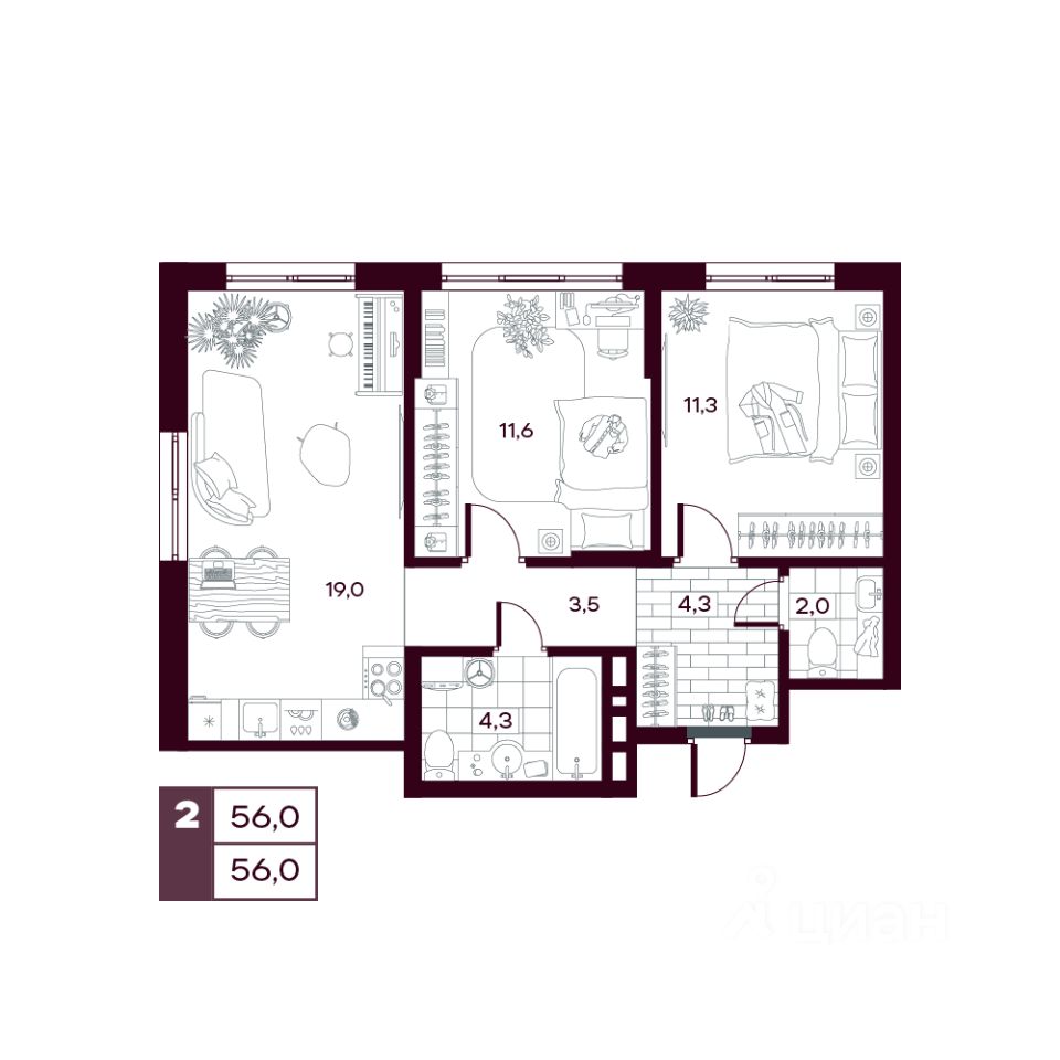 Общая площадь55,95 м²