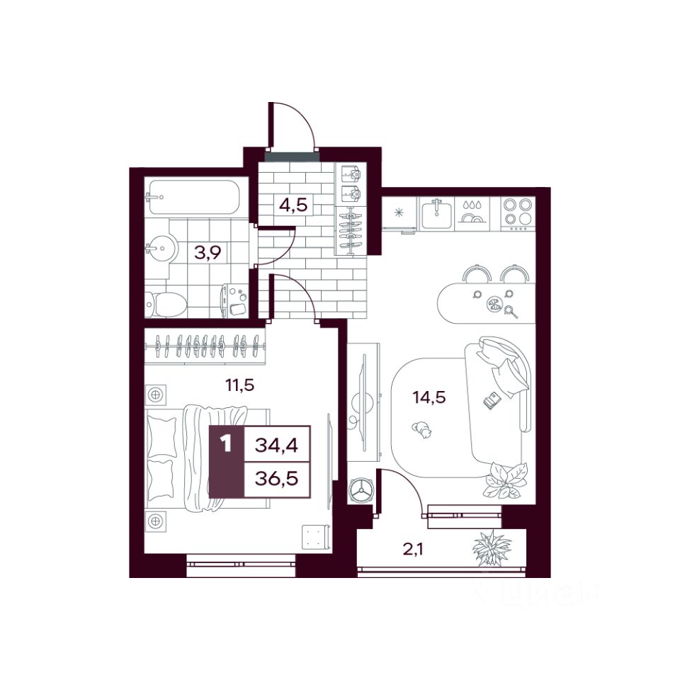 Общая площадь36,1 м²