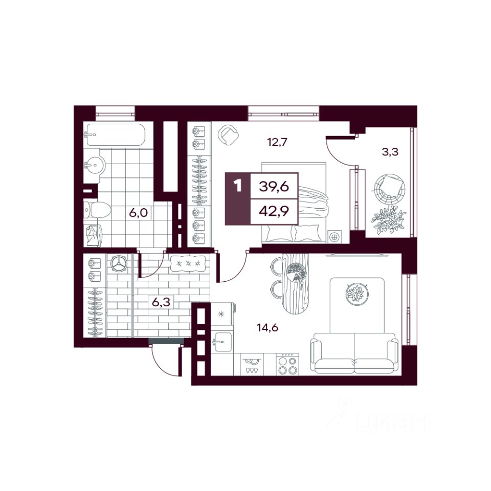 Общая площадь42,98 м²