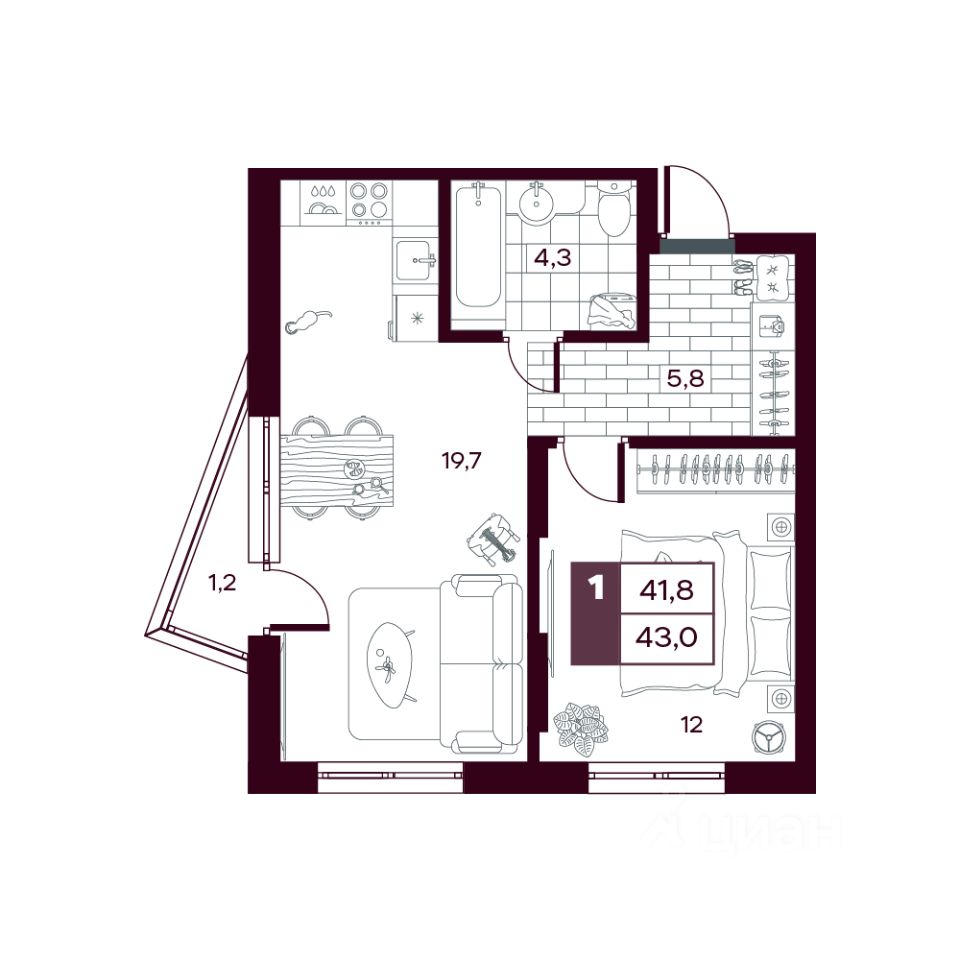 Общая площадь43,82 м²