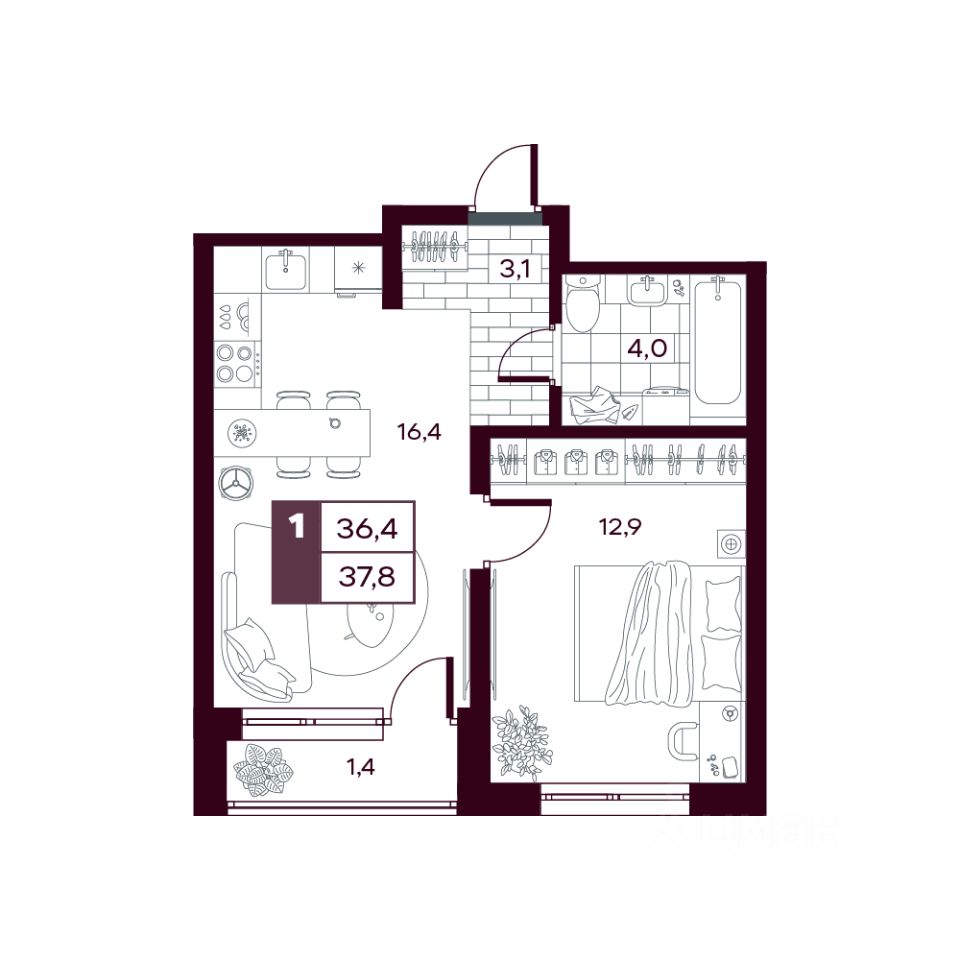 Жилая площадь12,9 м²