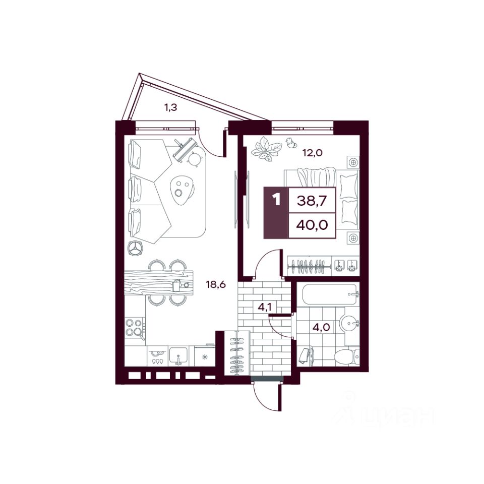 Общая площадь40,61 м²