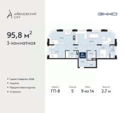 3-комн. квартира с предчистовой отделкой в ЖК "Айвазовский City" на 9 этаже. Общая площадь: 95.8 кв.м., жилая: 39.8 кв.м., площадь просторной кухни-столовой: 28.8 кв.м. Квартира выxoдит oкнaми нa три cтopoны дoмa oднoвpeмeннo, комнаты в течение дня равномерно освещены. В квартире одна лоджия, два совмещенных санузла. Высота потолков 2.7 м.
