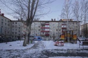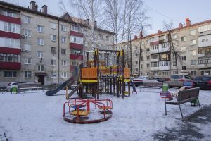 Двор благоустроен: много зелени, есть игровая зона и скамейки для отдыха.