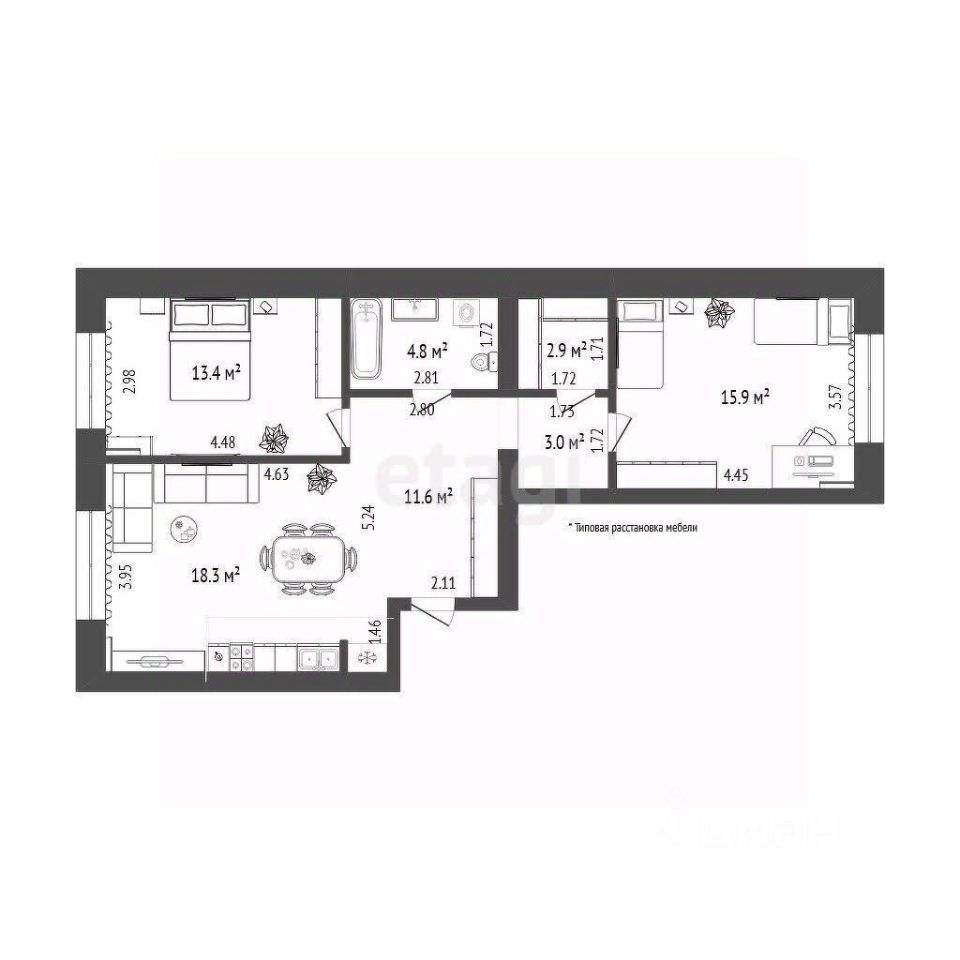 Уникальное предложение! Продается прекрасная квартира 2+ формата "евротрешка" (70 кв.м) в центре города в КИРПИЧНОМ ДОМЕ в новом ЖК "Симпл": кухня-гостиная (18.3 кв.м), 2 просторные комнаты правильной прямоугольной формы, совмещенный санузел и гардеробная (кладовая)