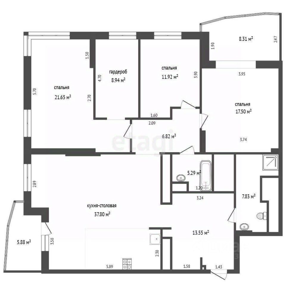 Два современных санузла с постирочной (5,29 м² и 7,83 м²) для вашего удобства.