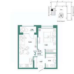 Продается 2комнатная квартира на 9 этаже от застройщика Страна Девелопмент. Площадь квартиры 36,52 кв. м.