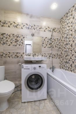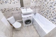 В ванной предусмотрена удобная зона мойки над стиральной машиной, что делает использование пространства максимально функциональным.
