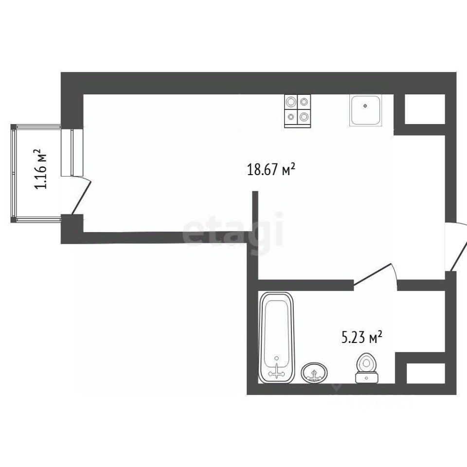 Квартира оснащена большим санузлом — это большая редкость для студий. Правильной формы комната и французский балкон открывают великолепные виды на окружающий пейзаж.