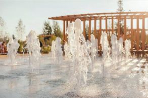 Общественные пространства Айвазовский. Такие как парк с фонтаном, пешеходный бульвар с водным каналом и оборудованными местами отдыха вдоль него.