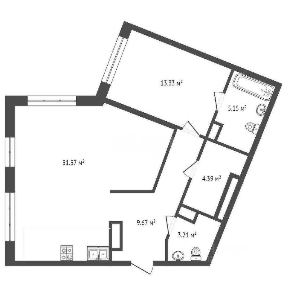 Функциональная планировка в квартире: просторная кухня-гостиная 31 кв.м., спальня с собственным большим сан.узлом., гарберодная, большие окна на две стороны.