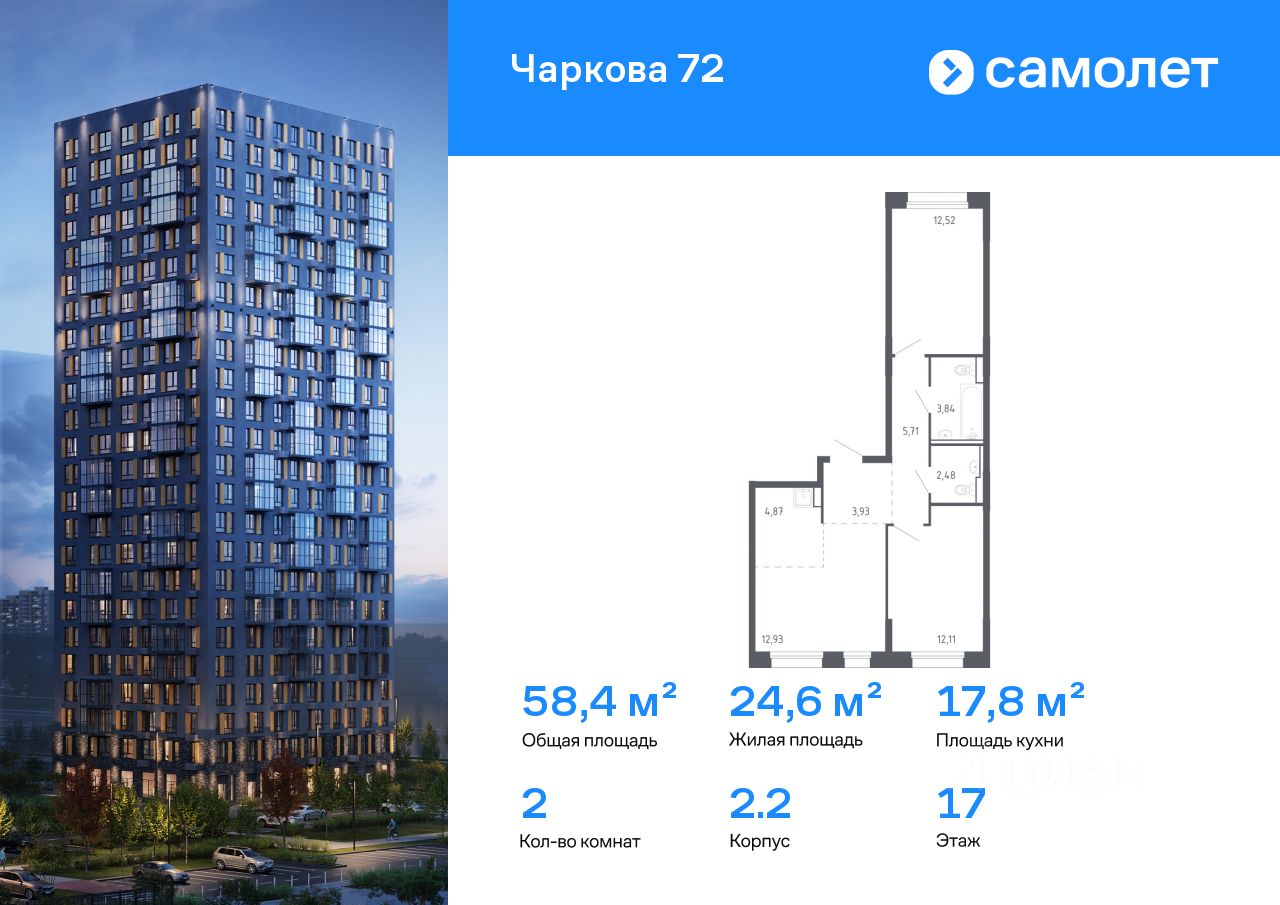 Строим кварталы для жизни с заботой о будущем. Предлагается 2-комнатная квартира комфорт-класса 58,39 кв.м в корпусе 2.2 на 17 этаже, в ЖК "Чаркова 72"